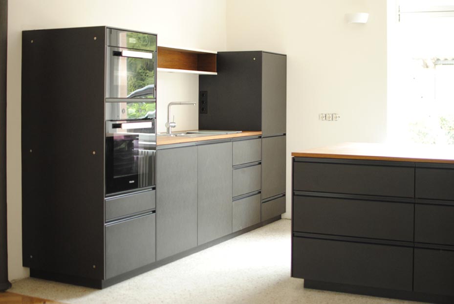 Entwurf und Einbau einer Küchenzeile und Kochinsel für eine umgebaute Remise (Arbeitsplatten Teakholz geölt, Fronten MDF anthrazit eingefärbt)