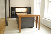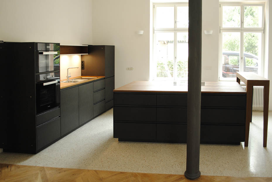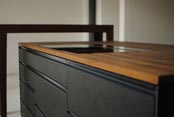 Entwurf und Einbau einer Küchenzeile und Kochinsel für eine umgebaute Remise (Arbeitsplatten Teakholz geölt, Fronten MDF anthrazit eingefärbt)